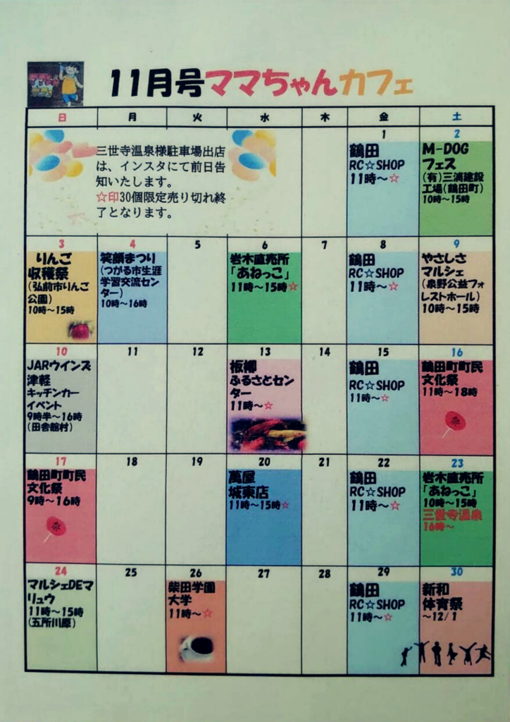 そこで、11月の出店スケジュールをお知らせします。お近くにお越しの際は、ぜひママちゃんカフェのキッチンカーに立ち寄ってくださいね!
